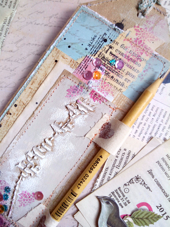 Когда "бутерброды" из чипборда и бумаги приклеивала, а затем пристрачивала к основе закладки, не забыла поместить между слоями ткань для петелек для карандаша.